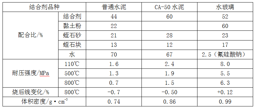 蛭石耐火澆注料的使用溫度為600~800℃。其特點是絕熱性能好、材料易得、價格低廉。該澆注料的配制,與珍珠巖耐火澆注料的基本相同。表1-1為蛭石耐火澆注料的配合比和性能。 表1-1 蛭石耐火澆注料的配合比和性能
