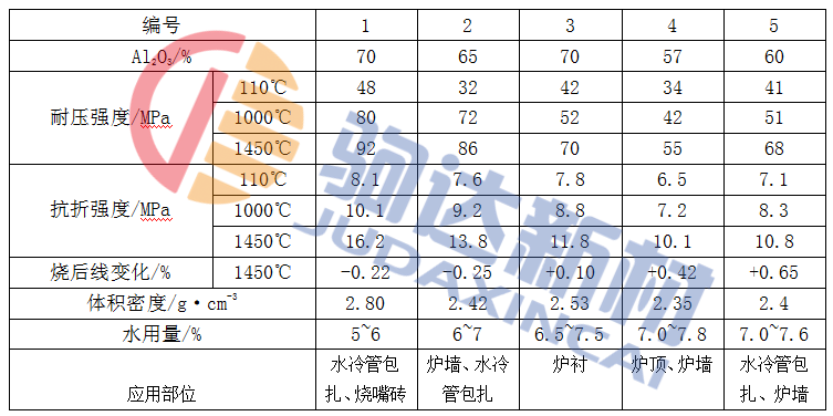 表1-1為加熱爐用自流耐火澆注料的性能。耐火骨料用三級礬土熟料,有時摻加一級礬土熟料和莫來石骨料。耐火粉料則用特級礬土熟料粉、剛玉粉和莫來石粉,同時添加α-Al2O3和SiO2超微粉和膨脹劑,用鋁酸鹽水泥作結合劑并加磷酸鹽減水劑。