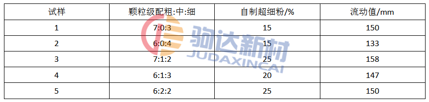 骨料對流動性的影響表現在多方面:顆粒形狀,級配,粒徑,吸水性等。顆粒的形狀愈接近球形,顆粒間相互接觸的面積愈小,流動性愈好。骨料的吸水性小,則混合料用水量在較小的情況下就足以保證形成溶膠并使顆粒之間能夠自由流動。顆粒級配是影響流動性能的重要因素。該試驗中顆粒范圍為:粗顆粒5〜1.2 mm;中顆粒1.2〜0.3mm;細顆粒0.3〜0.045mm;超細粉< 0.045mm。細粉用量不足時,骨料與細粉之 間存在著分離傾向,流動性差或不流動;中顆粒用量較多時,因骨料之間的直接接觸,使流動性顯著下降;細粉用量過多時,則施工后細粉產生分離現象,或產生高粘度,影響流動性。采用不同的粗中細顆粒級配,觀察其相應的達到穩定的流動性時所需的超細粉最小用量,試驗結果見表3。