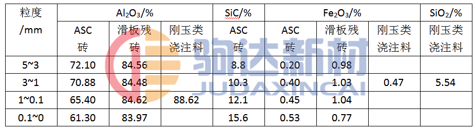 試驗(yàn)所用主要原料:88級(jí)礬土均化料顆粒,棕剛玉,97#碳化硅,活性氧化鋁微粉,純鋁酸鈣水泥、硅微粉、金屬硅粉,球狀瀝青。主要替代原料的主要化學(xué)組成如表1所示,其中ASC磚及滑板殘磚再生料均為碾壓處理后。