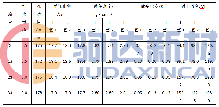再生料替代原料,加水量有一定比例的增加,但不影響澆注料的性能,滿足施工要求。