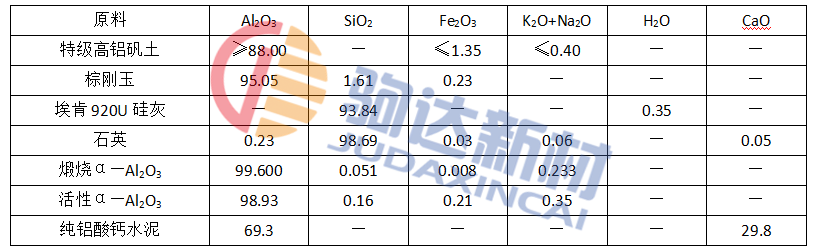 試驗選用的原料主要有特級高鋁礬土顆粒(0~1、1~3、3~5和5~8mm),棕剛玉(0.074mm),純鋁酸鈣水泥,埃肯920U硅灰,煅燒α—Al2O3微粉,活性α—Al2O3微粉,石英粉和廣西白泥,減水劑為三聚磷酸鈉。主要原料的化學成分列于表1。