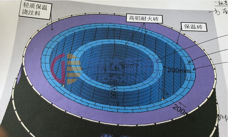 我公司是專業從事耐火材料的生產制造與窯爐的設計安裝工作,主要生產耐火磚有高鋁材質、粘土材質、剛玉材質、碳化硅材質和輕質隔熱耐火磚等耐火材料,近期我公司收到東莞雄冠環保科技有限公司,發來的30t熱解爐使用耐火材料的分布圖并希望能夠得到我公司在材料與設計安裝上的支持,收到相關資料后我公司設計安裝部門進行了核對,并繪制相關使用的萬能弧耐火磚的設計砌筑方法。雄冠環保提供的熱解爐相關資料。
