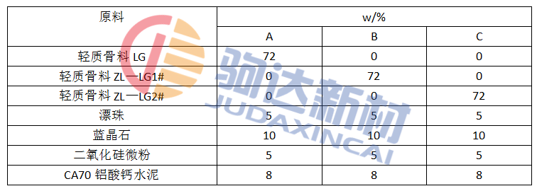 為研究3種輕質骨料對澆注料性能的影響,將耐火骨料和粉料按照5:5的質量比混合均勻,保證實驗配比不變,只改變所添加輕質骨料種類,制備3組試樣A、B和C,分別代表利用骨料LG、ZL—LG1#和ZL—LG2#制備的澆注料試樣。具體配比交表2。