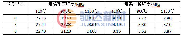 從表1可以看出,加入3%軟質粘土對烘干強度影響不大,但加入6%軟質粘土使烘干強度明顯下降。