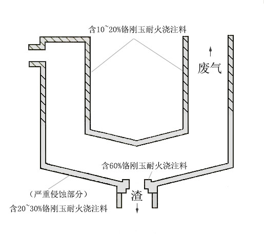 考慮到成本的問題,在實(shí)際應(yīng)用中,廢棄物熔融爐用鉻剛玉耐火澆注料的應(yīng)用配置如圖1所示。在熔渣侵蝕較為嚴(yán)重的部位渣口部位采用鉻含量在60%的鉻剛玉耐火澆注料,在受侵蝕相對較低的下錐段采用鉻含量在20~30%的鉻剛玉耐火澆注料。在熔融爐接近入料口和廢氣口的爐壁采用鉻含量10~20%的鉻剛玉耐火澆注料。