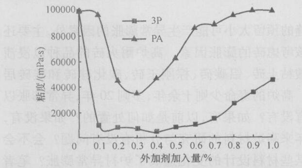 低水泥耐火澆注料在生產(chǎn)時需添加適量的輔助原料以改變成品的性能,減水劑是其中的一類選用減水劑三聚磷酸鈉 (3P)和氨基磺酸鹽系 (PA)。做成品的實驗,試驗原料的配比如下 :高鋁礬土粉 53% ,水泥 (CA - 70 ) 13% ,硅灰 7% ,α-AL2O3微粉10% ,石英粉 7% ,廣西粘土 10%。將配好的料充分混合均勻制成干混料 ,然后稱取 1 kg混合料 ,分別加入不同量的減水劑 3P和 PA,再加水 (加水量為干粉質(zhì)量的30% )攪拌3 m in后 ,成為高濃度的懸浮漿體,立即測量此漿體的粘度。