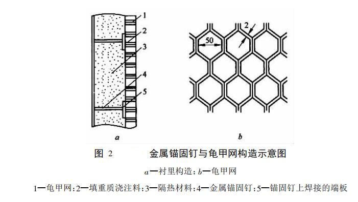 圖2為金屬錨固釘與龜甲網構造示意圖。該構造在催化裂化裝置等熱工設備上,得到了應用。其龜甲網采用2mm厚的耐熱鋼制作,網孔對邊距離為50mm,網高20mm,固定在錨固釘上,而錨固釘焊接在爐殼鋼板上,其間距為200~300mm