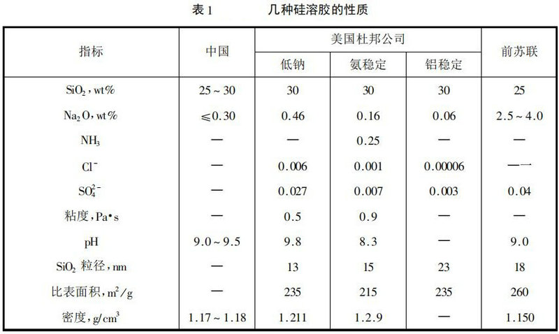 硅溶膠即硅酸溶膠,呈乳白色膠液,帶負電性,其通實為xSiO2·H2O,由下列成分構成:偏硅酸(H2SiO3),二偏硅酸(H2SiO2)2,和正硅酸(H4SiO4)。膠體粒子約10~80mm。硅溶膠的制備方法很多,如水解四乙氧基甲硅烷:電解、滲析、電滲析硅酸鈉溶液:水解四氯化硅或硅酸酯:用氣態(tài)氟處理硅酸鈉:分散硅凝膠懸浮液等。最廣泛使用的方法有酸法、離子交換法和電滲析法。各種硅溶膠的性質(zhì)如表1