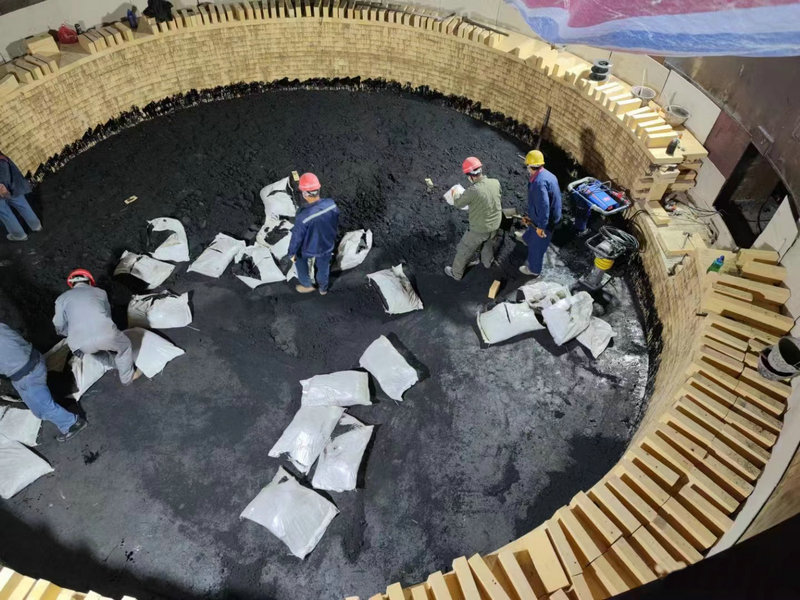 保溫電弧爐熱熔渣經(jīng)調(diào)質(zhì)后熔渣為酸性熔渣,酸度系數(shù)1.7-1.8。爐墻耐火材料經(jīng)酸性熔渣沖刷,導(dǎo)致使用壽命十分有限,熱熔渣中CaO-SiO2含量占比70%。爐墻耐火材料在熔渣出渣時液位降低導(dǎo)致爐墻與空氣接觸使耐材氧化嚴重。爐底因熔渣未全部倒出形成保護層且溫度穩(wěn)定,采用預(yù)焙碳磚砌筑爐底可行。