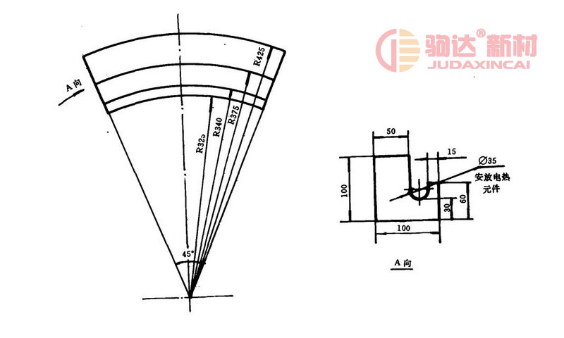 用重質耐火磚作為爐襯耐火層而原有的爐膛尺寸不變,耐火磚的尺寸如圖根據原爐膛直徑而定圖中耐火磚適用于爐膛直徑φ1200的井式爐,改造省去擱絲磚保溫層仍用原有的保溫材料砌筑填充,電爐其它部位無需任何改動。 所需異型耐火磚可由耐火材料廠定做