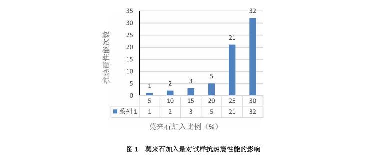 以白剛玉、燒結莫來石為主要原料,以AL2O3微粉、Cr2O3微粉、少量添加劑為基質,以進口木質素溶液為結合劑,莫來石加入量(質量分數分別為05%10%15%20%25%30%)對鉻剛玉磚抗熱震性能和其他物理性能的影響。結果表明:1600℃燒后試樣,隨著莫來石加入量的增加,體積密度和耐壓強度均會呈下降趨勢,抗熱震性能則呈逐漸增加趨勢,但增加的量并不明顯,只有加入量在25%以上時抗熱震性能則會降低。綜合對比,莫來石加入量在25%~30%著個區間比較合適,既能滿足熱震需求,又能保證其他物理指標處于均衡狀態。不同莫來石加入量對試樣抗熱震性能的影響如圖1所示